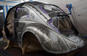Steam Punk inspired airbrushed artwork on a 58 VW Beetle. Ready for clear at Andys Restorations.